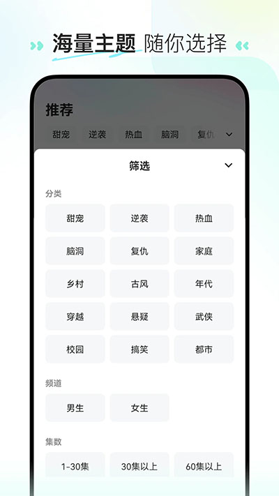 2、平台汇聚海量短剧题材,并设置了丰富的标签分类,你可以依据自身兴趣快速筛选出心仪的内容;