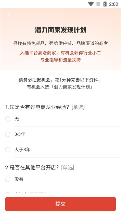 进入平台后,点击完善相关资料,其中包含有无从业经营、是否在其他平台开店、年经营规模、前期投入人数等问题,完成后点击提交即可。