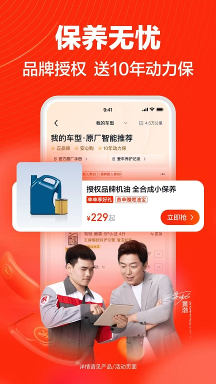 精准匹配不同车型的大小保养需求,提供正品机油,保养项目覆盖刹车系统、空调系统、自动变速箱等。此外,还享有发动机与变速箱10年质保服务,让您售后无后顾之忧。