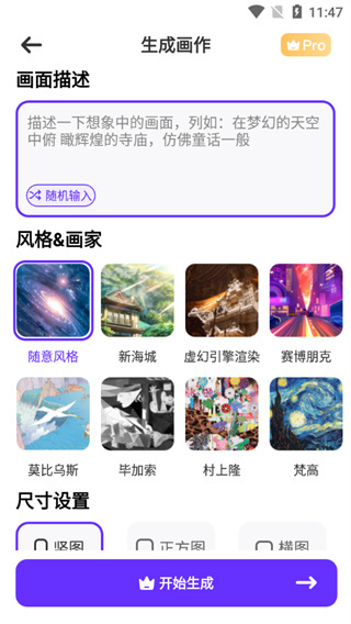 2、输入自己的灵感,然后选择好自己喜欢的风格及图片尺寸;