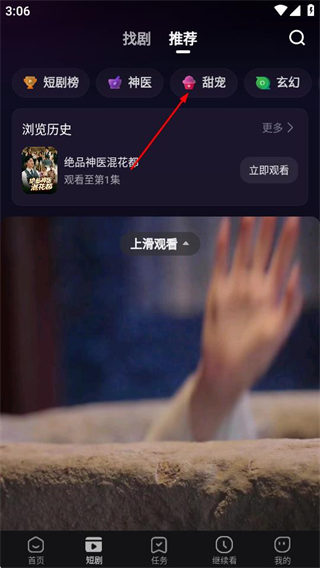 2、在短剧页面,点击甜宠标签,切换至甜宠类短剧列表。