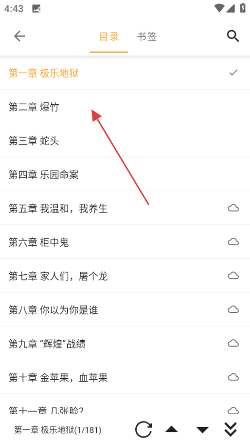 3、点击目录后,会显示小说的章节列表,你可以选择任意章节点击,直接跳转到对应的内容,方便快速阅读自己想看的章节。