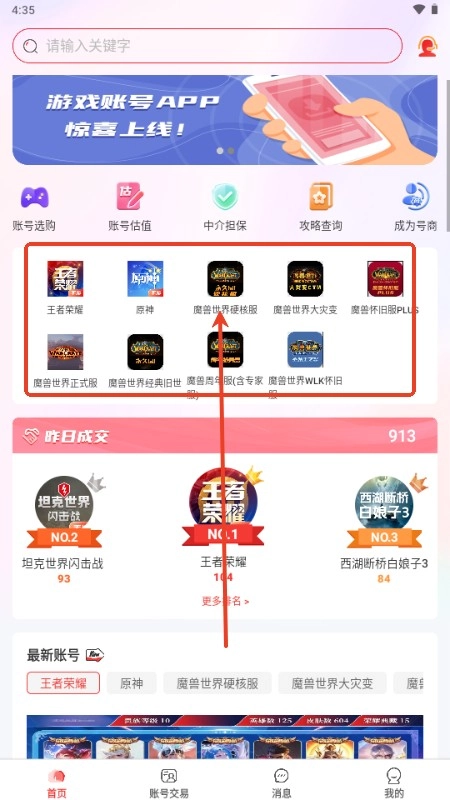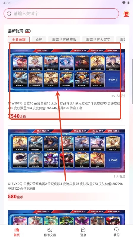 成功进入首页后,我们就能看到各类热门的游戏账号。