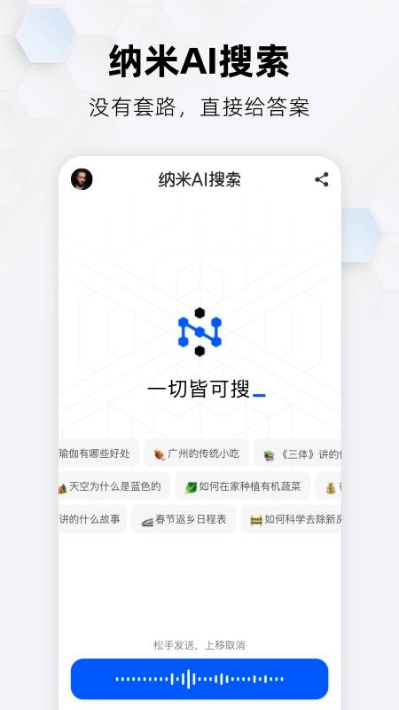 纳米AI搜索是一款功能强大的智能AI搜索工具,支持文字、语音、拍照等多种搜索方式,能一站式满足用户的各类搜索需求。此外,软件还配备了PDF文档分析、Word文档分析、论文分析、录音AI总结等实用AI工具,为工作和学习助力添彩,快来体验吧!