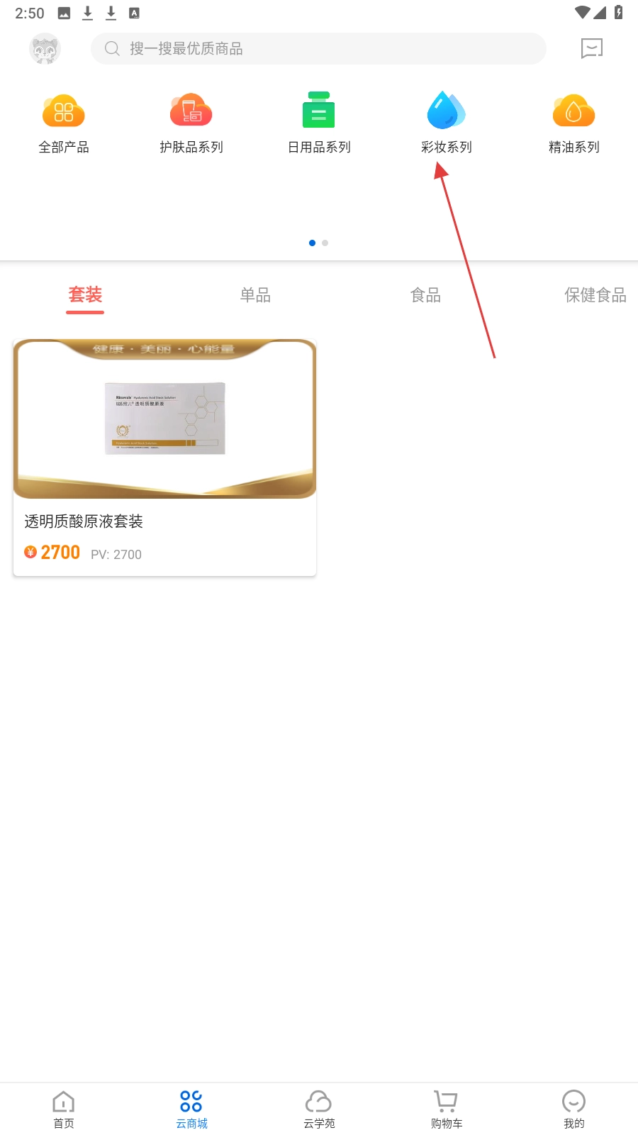 在云商城平台上,找到并点击【彩妆系列】分类,浏览该分类下陈列的各类彩妆商品。
