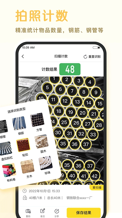 扫描计数功能支持拍照计件,通过智能AI识别钢筋、钢管数量,可手动调整数量(增加或减少),并能一键分享或保存计数结果。