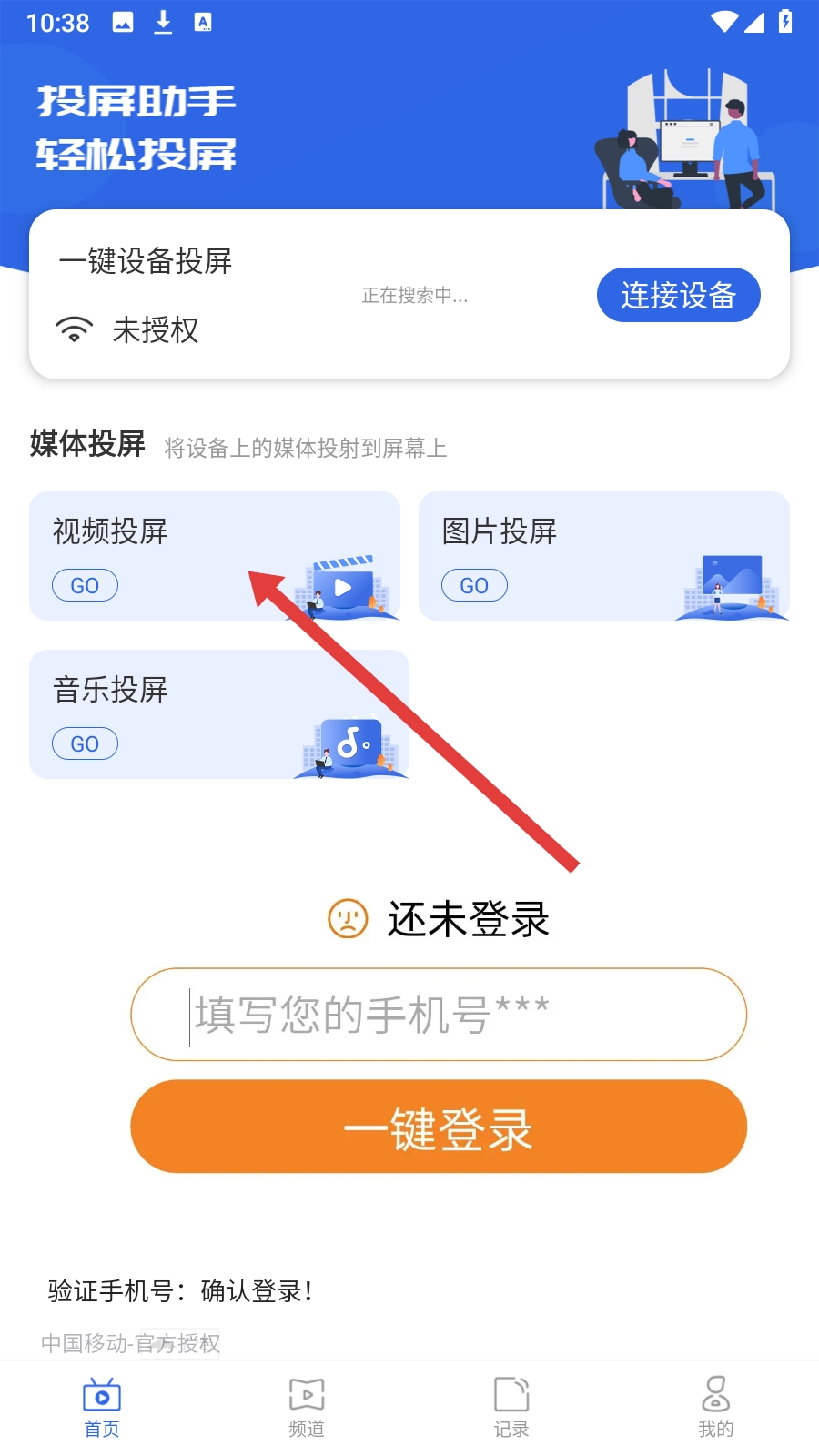 2、在投屏助手的主界面中点击【视频投屏】选项,即可进入视频投屏的设置界面。