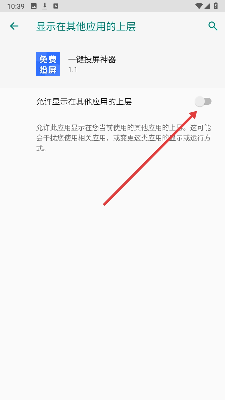 3、进入视频投屏的设置界面后,找到并开启【允许显示在其他应用的上层】这一选项,以此完成相关权限的配置。