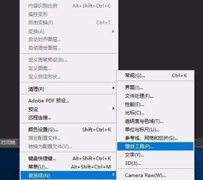 3、接着打开Photoshop软件,点击顶部菜单栏的“编辑”选项,在弹出的菜单里选择“首选项”,再从弹出的二级菜单中点击“增效工具”。