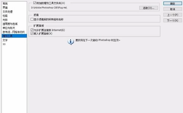 4、进入增效工具设置页面,勾选“附加的增效工具文件夹”选项,接着点击【选取】按钮并选择plug-ins文件夹,选好后点击【确定】即可。