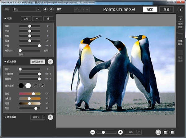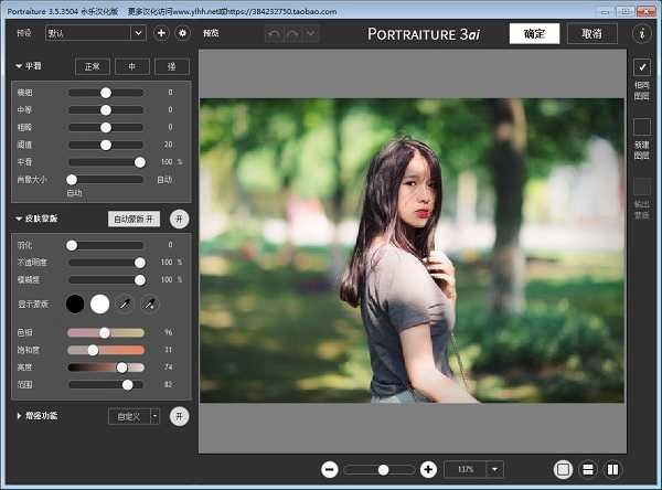 1.Portraiture磨皮能保留下细小的毛孔,保留皮肤质感,这是其它很多磨皮柔肤软件所不具备的(多数软件磨皮后,面部皮肤就就像剥完皮的鸭蛋,失去皮肤质感)。