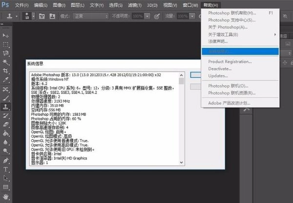 注:打开Photoshop软件,点击“帮助”选项在弹出的菜单选项中选择“系统信息”进行查看Photoshop的版本信息