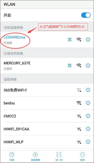 3、选择以LED6W开头的WIFI网络进行连接,若系统提示需要输入密码,则填写控制卡的默认密码:12345678