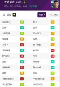 速度99,盘带99,射门93,身体居然也有84!