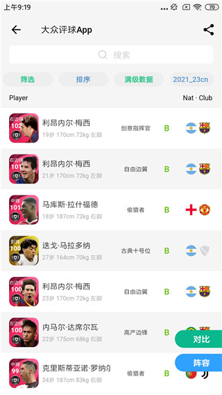 大众评球实况足球数据库安卓版可以在这里一站式查看球队或者球员的攻击能力、射门、控球、盘球、地面传球、空中传球、定位球、弧度、头球、脚下力量等等数据查看,让用户更好的了解球员的基本情况。