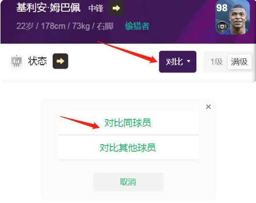 如果你要对比姆巴佩自己,则选择“对比同球员”就可以了