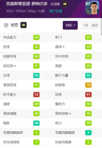 目前C罗是一个近似值,我们和master讨论之后定在了19级,因为目前的等级列表里面,35岁,初始93级是空的,不知道后续会不会进行调整,如果是19级的话,C罗其实这个数据有点类似全能前腰的意思,踢边锋的话速度88可能有点麻烦。