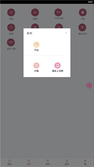 4、点击发布,你可以发布你的作品,也可以约稿和发布漫画招聘;