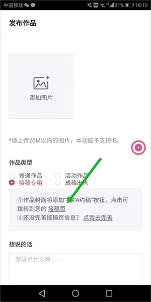 3、在打开的新页面中上传自己擅长的接单类型作品,以及其它信息的输入和选择,特别是作品类型这里要选择【接稿专用】