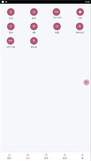 1. 打开手机中的画师联盟接单平台app,进入首页,点击底部中间的【发布】按钮。