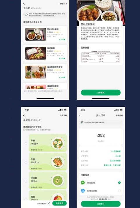 1、餐费缴纳:为孩子选择套餐,进行缴费,便捷支付。