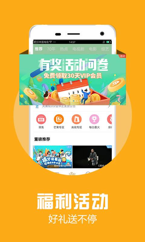 天翼视讯,这是一款由天翼视讯传媒有限公司精心打造的视频播放利器。用户能够参与天翼视讯的有奖问卷调查活动,进而在线免费领取30天的VIP会员。成为会员后,VIP院线大片、VIP热播影视等精彩内容都能抢先观看。 这款软件为用户提供了丰富多样的频道,涵盖电视剧、电影、综艺、动漫、体育等众多类型。使用它在线观看视频,就如同让手机瞬间变身电视机。它还支持用户在线追剧,并设有实时更新提醒功能,让你无需漫长等待。 软件提供多种画质的视频供用户选择,其中超清画质播放的视频,画面清晰度高得令人惊叹。会员不仅能免费观看视频,还能畅通无阻地观看。用天翼视讯看视频,精彩剧情时刻相伴。若你有观看视频的需求,欢迎前来体验。